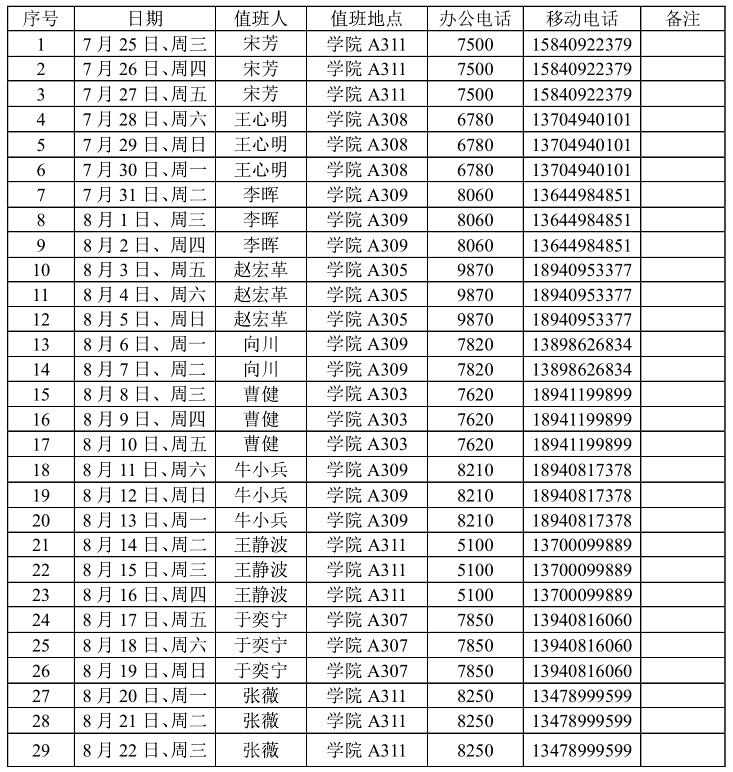 3、作息时间安排。7月23日-24日和8月23日-24日作息时间调整为:上午08:30—11:30,下午13:30—16:30。