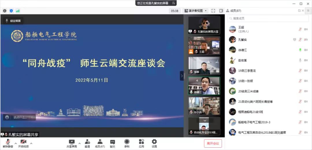 召开“同舟战疫”师生云端交流座谈会。学院院长赵宏革,党委书记徐德江,副院长于奕宁、牛小兵、李晖,学院全体专兼职学生指导员和各中队、班级本科生与研究生代表参会。会议由半军事管理大队大队长王超主持。
