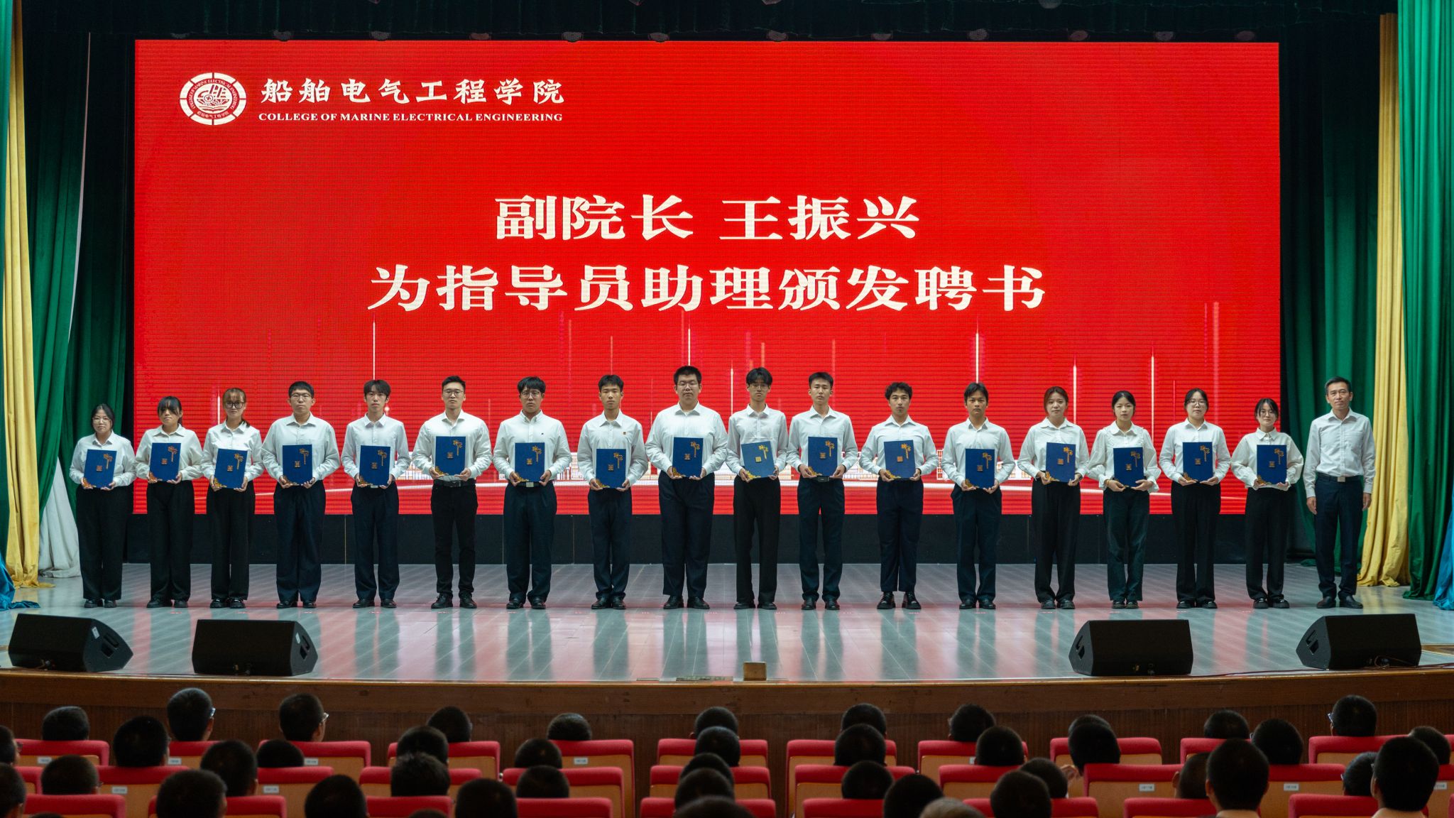 学生代表演唱原创主题歌曲《逐梦船电》,歌词中巧妙融汇了“同舟悟道,慧赢深蓝”的院训精神与鲜明的专业特色,充分展现了船电学子昂扬向上、团结进取的青春风采。