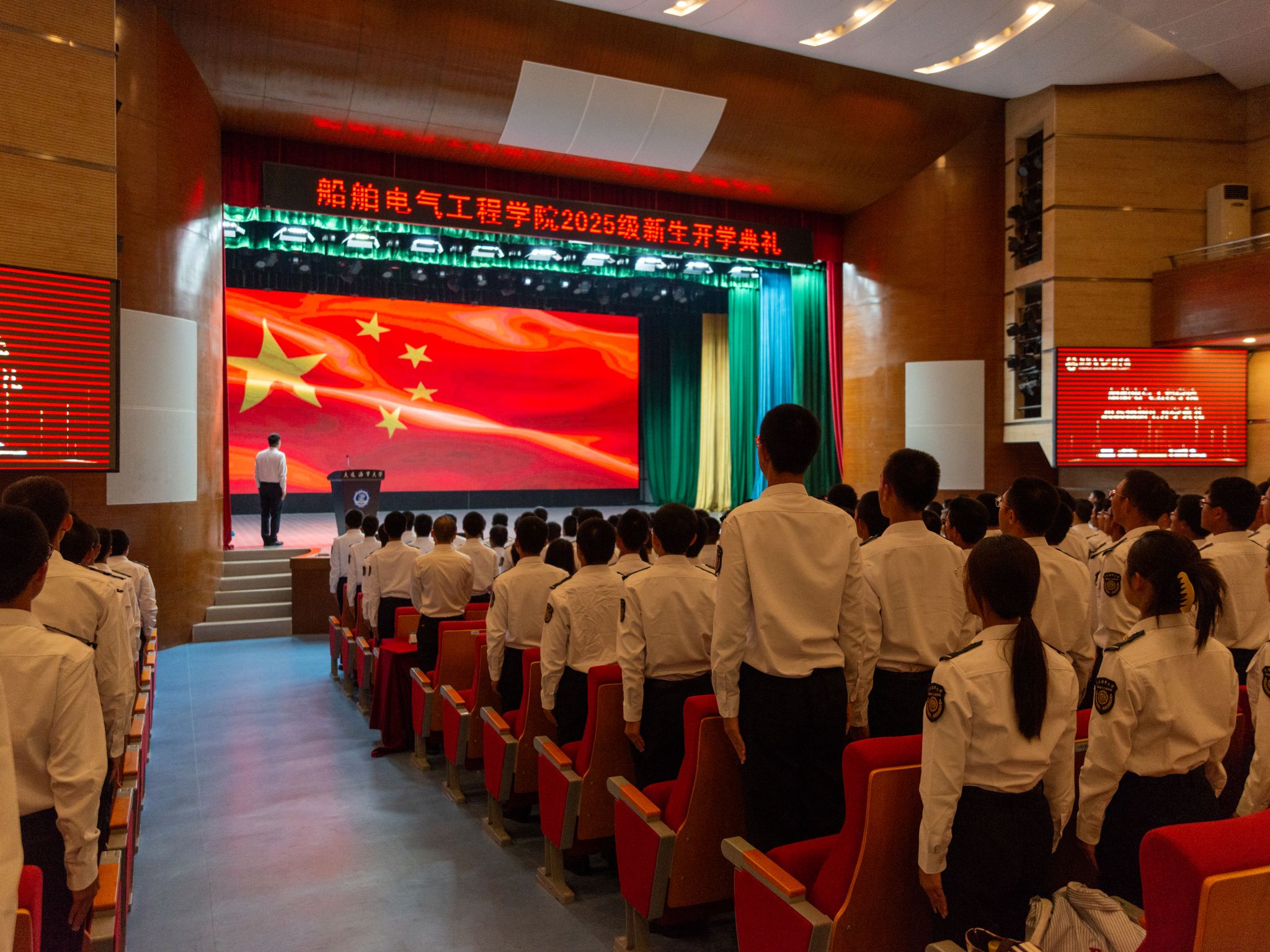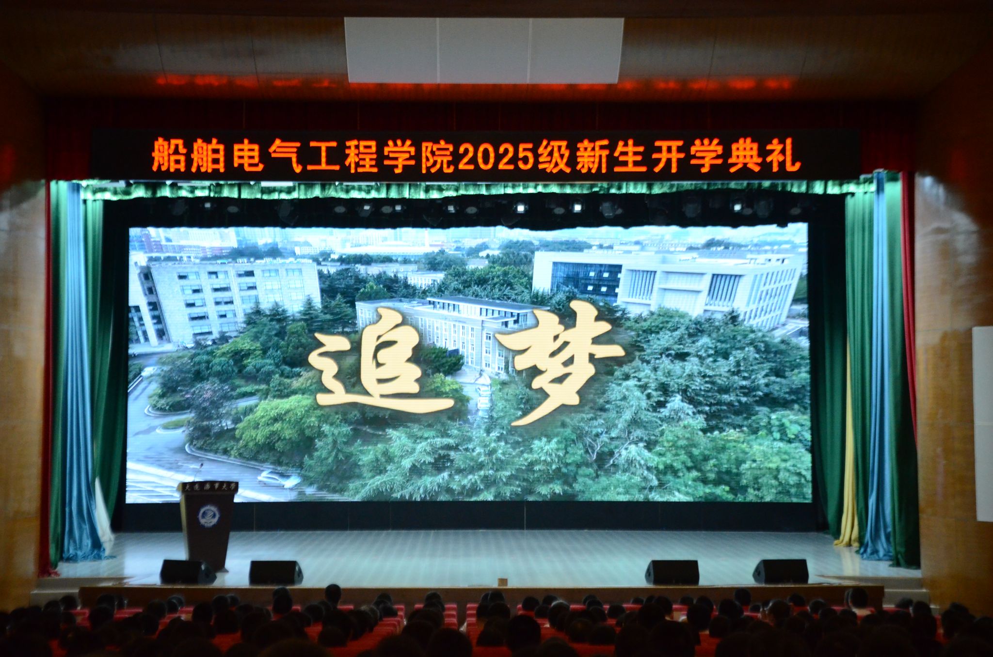 全场师生观看视频《追梦》,视频记录了2025级新生从烈日下的意志锤炼到汇报表演的荣光加冕,从星夜拉练的并肩前行到整装待发的深蓝誓言。视频生动展现了新生们通过军训磨砺出的钢铁意志与磅礴力量,激励全体船电新青年以此为始,在人生新征程中勇敢追梦。